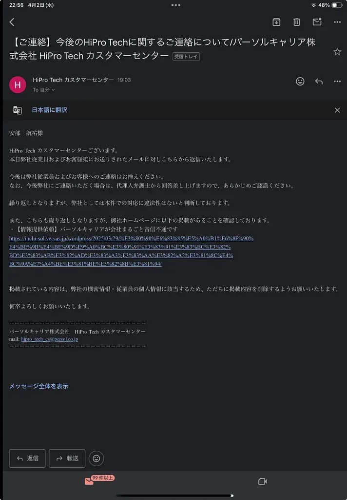 上記記事にございますように、「HiPro Tech カスタマーセンター」なる御社内のどなたかによれば、「今後の対応は代理人弁護士に行なっていただける」ものと考えております。そして、未だに音信不通状態を継続するパーソルキャリア株式会社の皆様に、はやく代理人弁護士の方におつなぎいただくように要求しておりました。