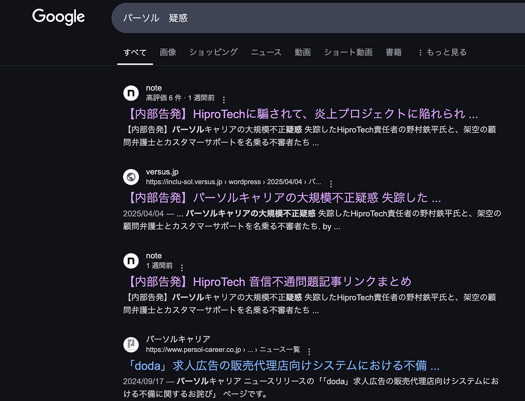 2025年4月現在、Google検索結果では 「野村鉄平 パーソル」 「HiproTech 疑惑」 といったキーワードで、弊社が発表した告白記事が上位に並んでいる。