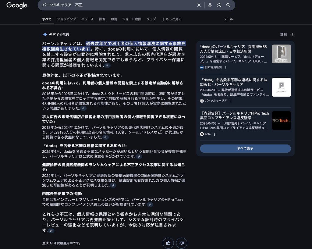 パーソルキャリアの名前を含む検索に対し、弊社が掲載した一連の問題提起が、ついにGoogle検索のAI要約領域に取り込まれた。