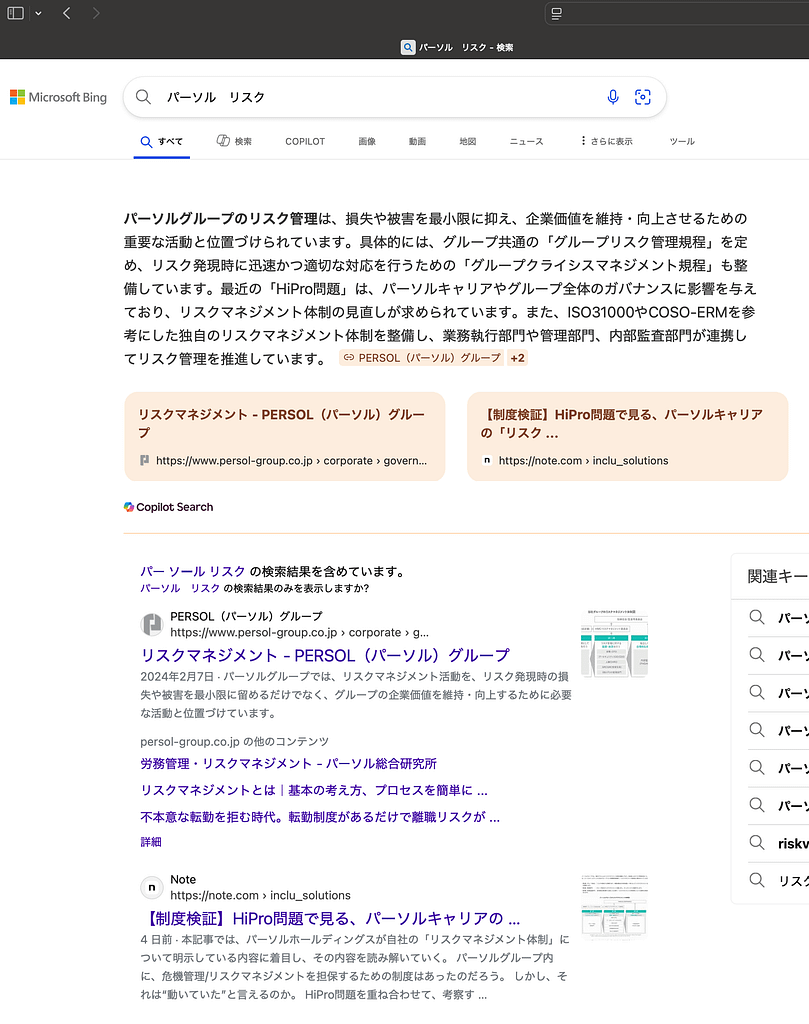 検索ワードは、「パーソル リスク」と検索した場合です。