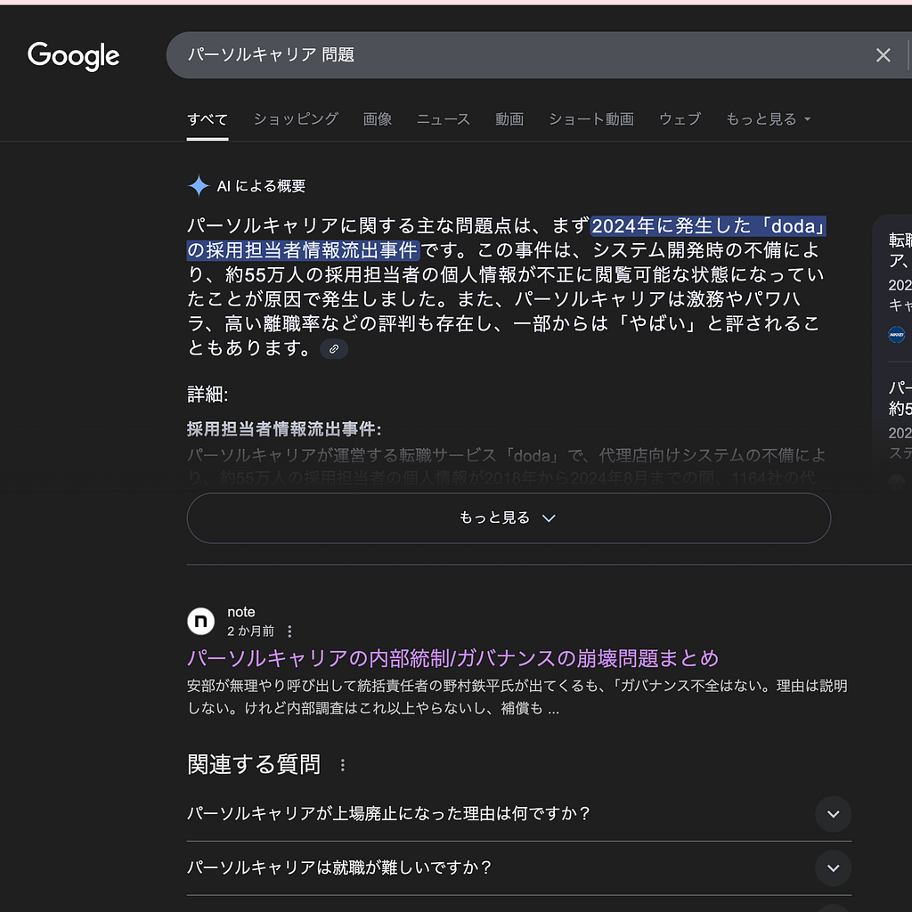 たとえば、上記の記事を確認ください。2025年6月12日時点で、「パーソルキャリア 問題」で検索したときに、googleで一位として表示される記事です。タイトルは、「パーソルキャリアの内部統制/ガバナンスの崩壊問題まとめ」です。