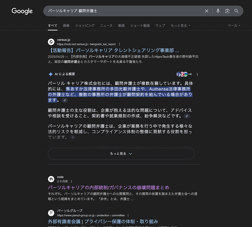 繰り返しますが、「パーソルキャリア 顧問弁護士」で検索した際に、一番に出てくるのが、「非弁行為を東京弁護士会に通報された記事」なのです。顧問弁護士について検索すると、一番に非弁行為の通報告発が出てきてしまい、結局同社の顧問弁護士は誰なのか?というのが、検索すれども不明なのです。