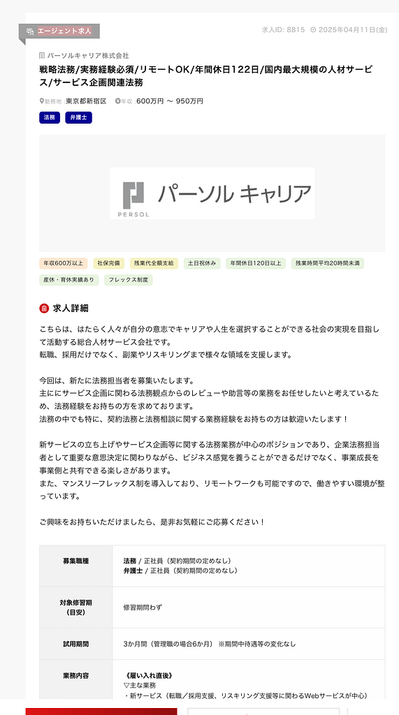 パーソルキャリアが、2025年4月11日に、下記のような弁護士を募集する求人を掲載していることを知り、この記事を書いています。