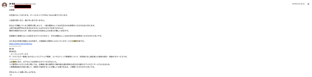 (2)HiPro Techサービス 「HiPro Techサービス」とは、以下の各サービスの総称をいいます。 受託サービス 委託者から当社が受託するIT・テクノロジー領域におけるコンサルティング業務等を、利用者に紹介し、委託するサービスです。 なお、具体的な業務内容、その他の取り決めは、別途当社と利用者との間で締結する委託契約書の定めによるものとします。 エージェントサービス IT・テクノロジー領域におけるエンジニアリング業務、コンサルティング業務等について、利用者に対し委託者との契約を紹介・斡旋するサービスです。 タレントシェアリング事業部のHiPro Tech統括部の担当者がどれほど主導権をもって案件を牽引する姿勢をみせても、決して任せないことがトラブル予防につながります。なぜなら、彼らはプロジェクトが炎上すると、プロジェクトの途中でいなくなるためです。逃亡するときには、上記規約を根拠として持ち出してきます。 参考までに、HiPro問題の原因となったプロジェクトでパーソルキャリア側の担当者であった東竜誠氏が弊社に送付したメール( 2025/02/19 12:41)も添付します。