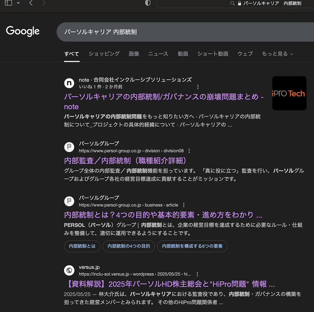 そしてその皮肉は、誰もがこの場で、そのパソコン・スマートフォンを使って、この場で確認することができる。Googleを開き、「パーソルキャリア 内部統制」と検索してみよう。2025年7月6日時点で、一位として表示されるのは「パーソルキャリアの内部統制/ガバナンスの崩壊問題まとめ」という弊社の告発記事だ。あなたも是非試してみてほしい。