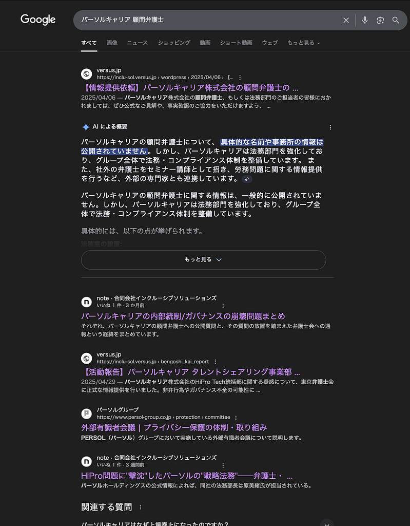 また加えて、パーソルグループが顧問弁護士の実在を明かせない状況が皮肉にもGoogleによって可視化された結果でもある。