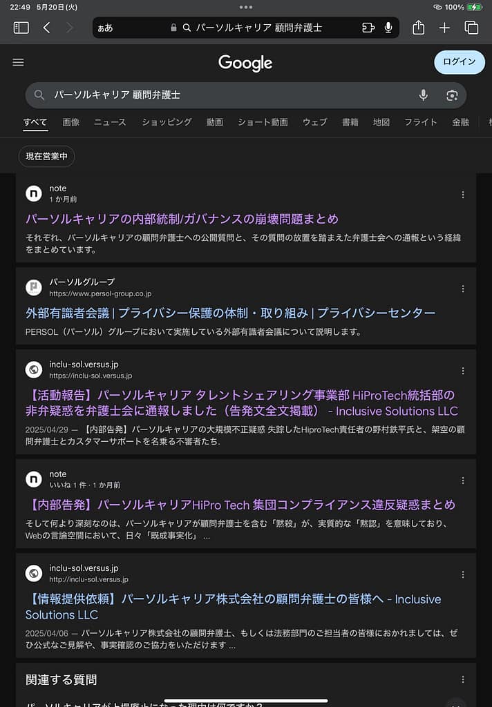 As of May 21, 2025, the top result on Google for “PERSOL CAREER legal counsel” was the Note article mentioned above.