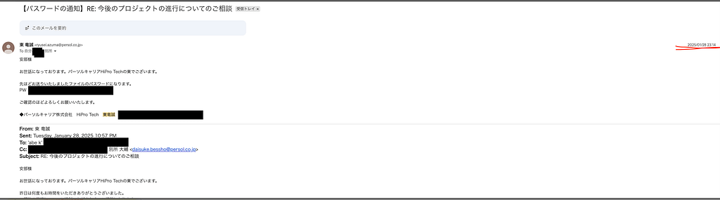 また、機密情報の送付のためのパスワードが深夜のメールで寄せられることもあった。しかし「20時に職場のPCが強制シャットダウン」されるのであれば、機密情報であるパスワードの送付メールは、一体どのPCから弊社に送信されたのだろうか。