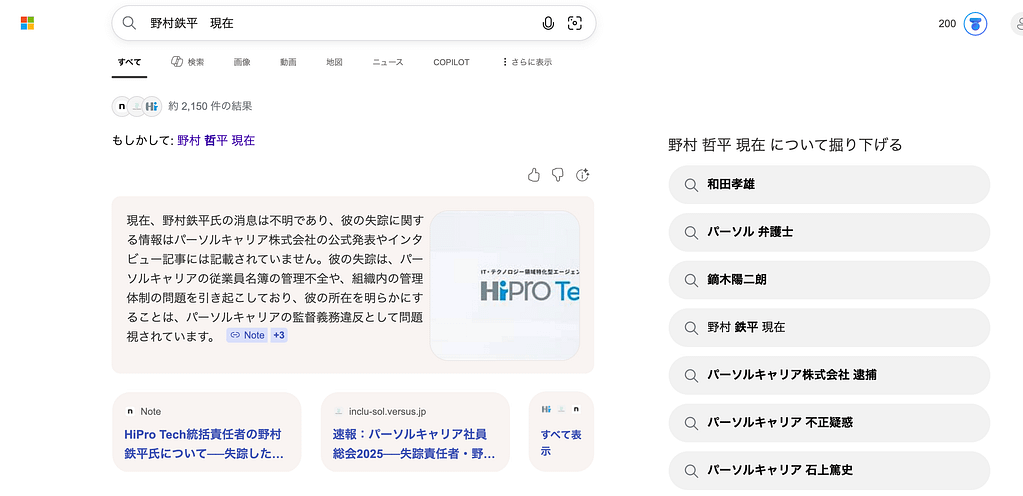 参考までに、MicroSoft社が提供する検索エンジン・Bingで「野村鉄平 現在」と検索した際の、検索結果の要約を引用します。